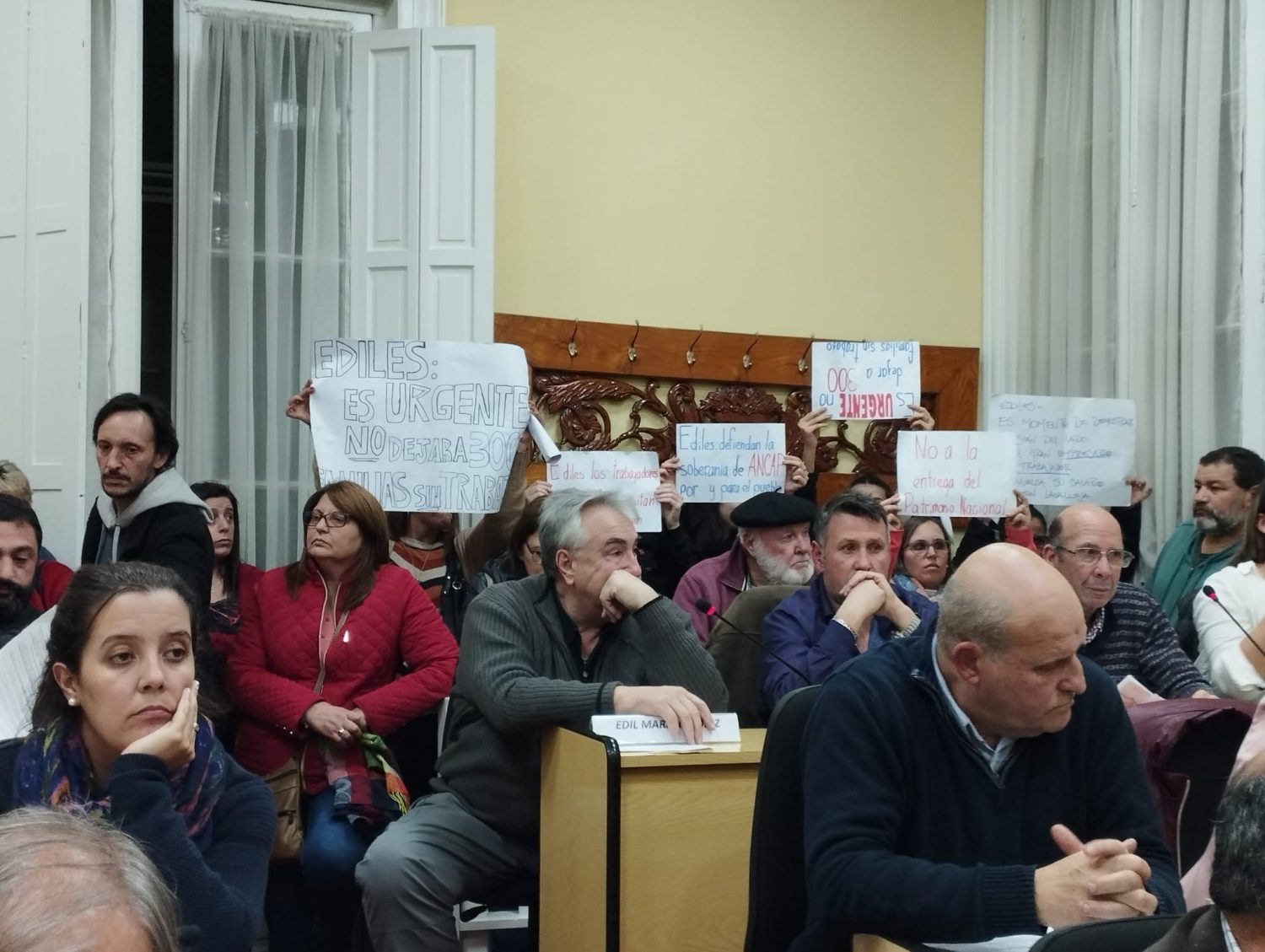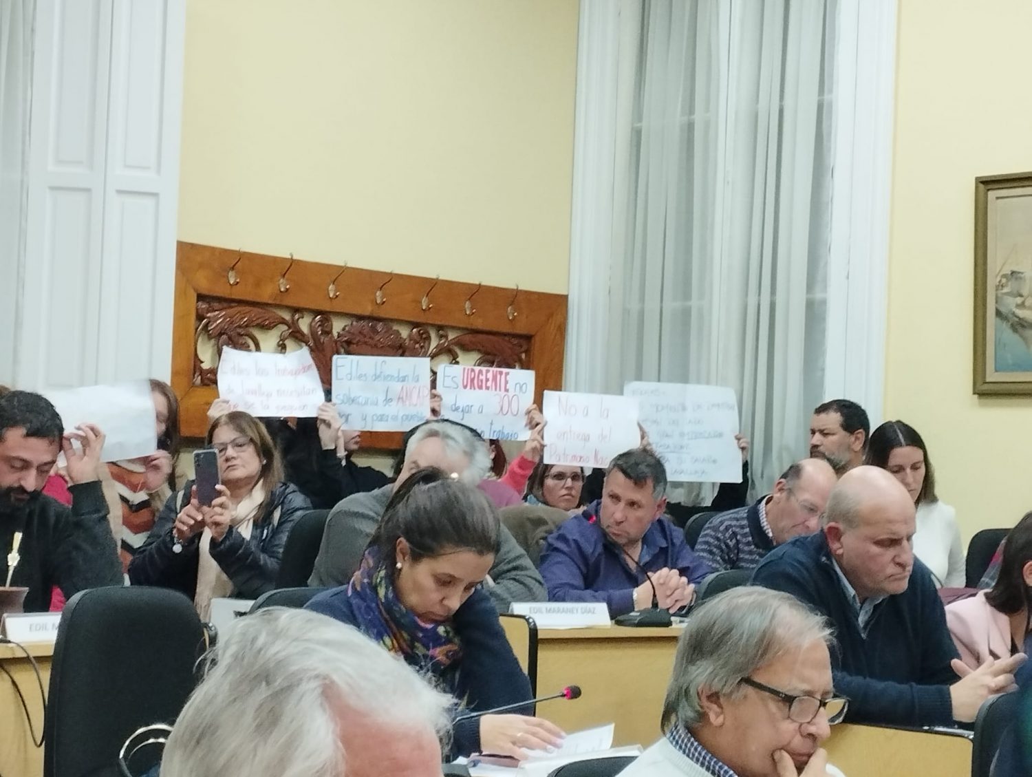 Por casi tres horas los ediles debatieron en torno a la propuesta del curul Miguel Sanz de «declarar de interés departamental la fábrica y el portland Ancap estatal y público de nuestro departamento». La discusión fue intensa por momentos, repetitiva por otros, mientras un grupo numeroso de trabajadores, vecinos y familiares seguían el debate desde afuera del recinto.